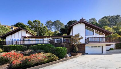 Wake to gorgeous lush canyon-to-ocean views from every bedroom in this gated Muirlands hillside home with bright, bold modernist architecture and wonderful light-filled living areas. In a superb location close to the Village, beaches, schools, and all sides of Soledad for easy freeway access, this home's vaulted roof and ceilings and walls of glass have been designed to embrace the natural environment and welcome guests to wide open living areas, a huge ocean view deck and private backyard grounds enjoying the blue sea and sunset views.