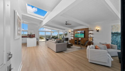 With spectacular panoramic eastern to southwest bay views, this architecturally fantastic North Pacific Beach property is a dream come true for aficionados of mid-century aesthetics and edited design. Perfectly renovated to maximize its original Kisler-Palmer structure in this superb, sought-after "Drogin Tract" location, this immaculate home's spacious flat patios and terraced grounds include a soaking pool, water features, outdoor barbecue, large putting green and orchard. Vast walls of glass doors bring the outdoor panorama to most living areas with vaulted skylit ceilings for a truly turnkey perfect move-in-ready experience.